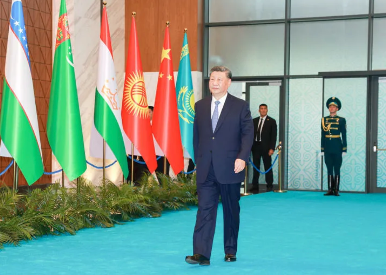 当地时间6月17日下午,第二届中国-中亚峰会在阿斯塔纳独立宫举行。哈萨克斯坦总统托卡耶夫主持会议。中国国家主席习近平、吉尔吉斯斯坦总统扎帕罗夫、塔吉克斯坦总统拉赫蒙、土库曼斯坦总统别尔德穆哈梅多夫、乌兹别克斯坦总统米尔济约耶夫出席。这是习近平步入会场。新华社记者 丁林 摄