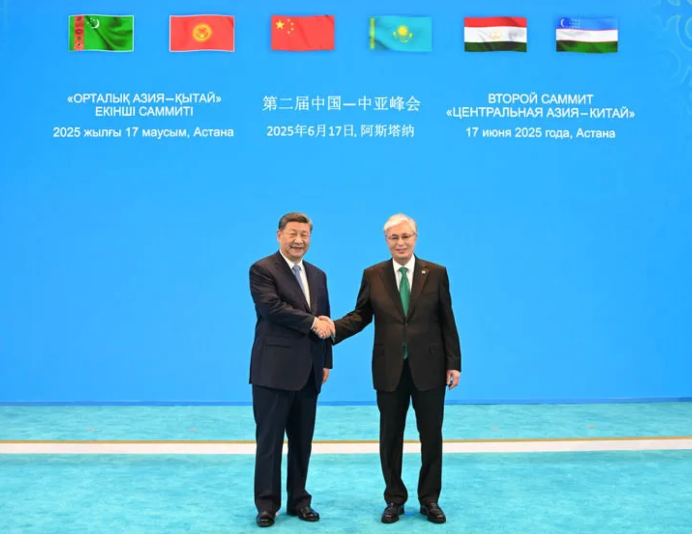 当地时间6月17日下午,第二届中国-中亚峰会在阿斯塔纳独立宫举行。哈萨克斯坦总统托卡耶夫主持会议。中国国家主席习近平、吉尔吉斯斯坦总统扎帕罗夫、塔吉克斯坦总统拉赫蒙、土库曼斯坦总统别尔德穆哈梅多夫、乌兹别克斯坦总统米尔济约耶夫出席。这是习近平同托卡耶夫握手。新华社记者 谢环驰 摄