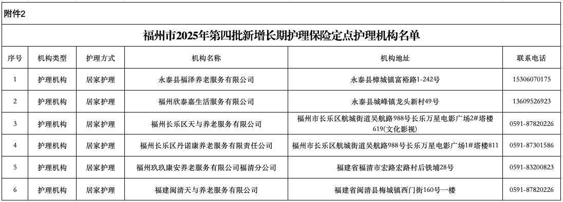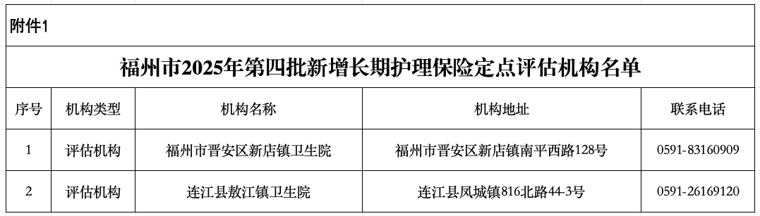 日前,经机构申请、现场核查、公示等程序后,福州市医保部门将符合条件的福州市晋安区新店镇卫生院等2家机构新增为福州市长期护理保险定点评估机构(附件1);将永泰县福泽养老服务有限公司等6家机构新增为福州市长期护理保险定点护理机构(附件2)。
