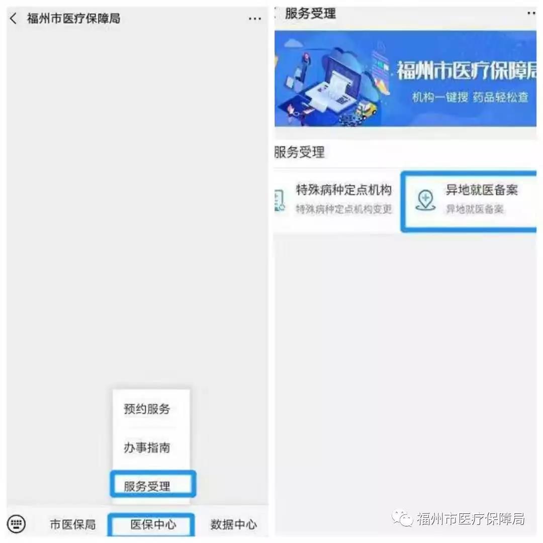 跨省异地就医人员既可以到医保经办窗口现场备案,也可以通过电话、传真、电子邮箱、“E点通”等多种备案登记渠道备案,方便参保人员办理异地就医手续,实现“一趟不用跑”。近期,新增了微信备案渠道,登录“福州市医疗保障局”微信公众号,点击右下角的“医保中心”进入“服务受理”,进入“异地就医备案”模块,按照提示操作即可。
